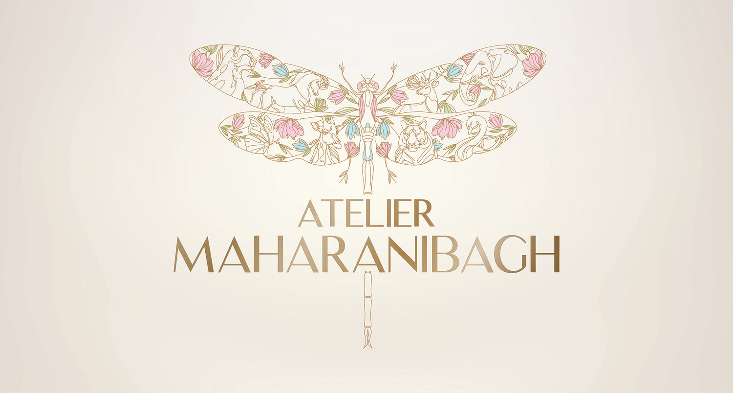Introducing the evolved emblem of Atelier Maharanibagh — the dragonfly, now adorned with wild companions of the earth. Lions, deer, elephants, giraffes — each animal delicately drawn into its wings, each one carrying a whisper of our untamed story.