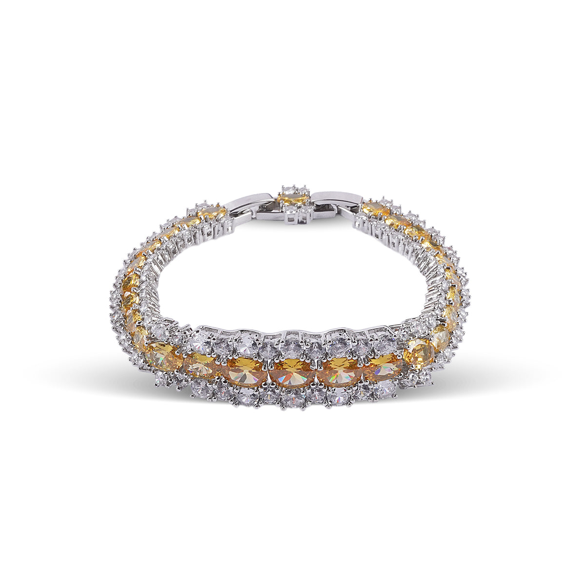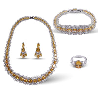 The necklace drapes like a work of art, adorned with lab-created Yellow Citrine hued stones and crystals —each precision-cut to capture light and release it in a fire of brilliance. Matching earrings complete the set, echoing the same architectural beauty and chromatic intensity, making this an all-occasion heirloom for the modern muse.