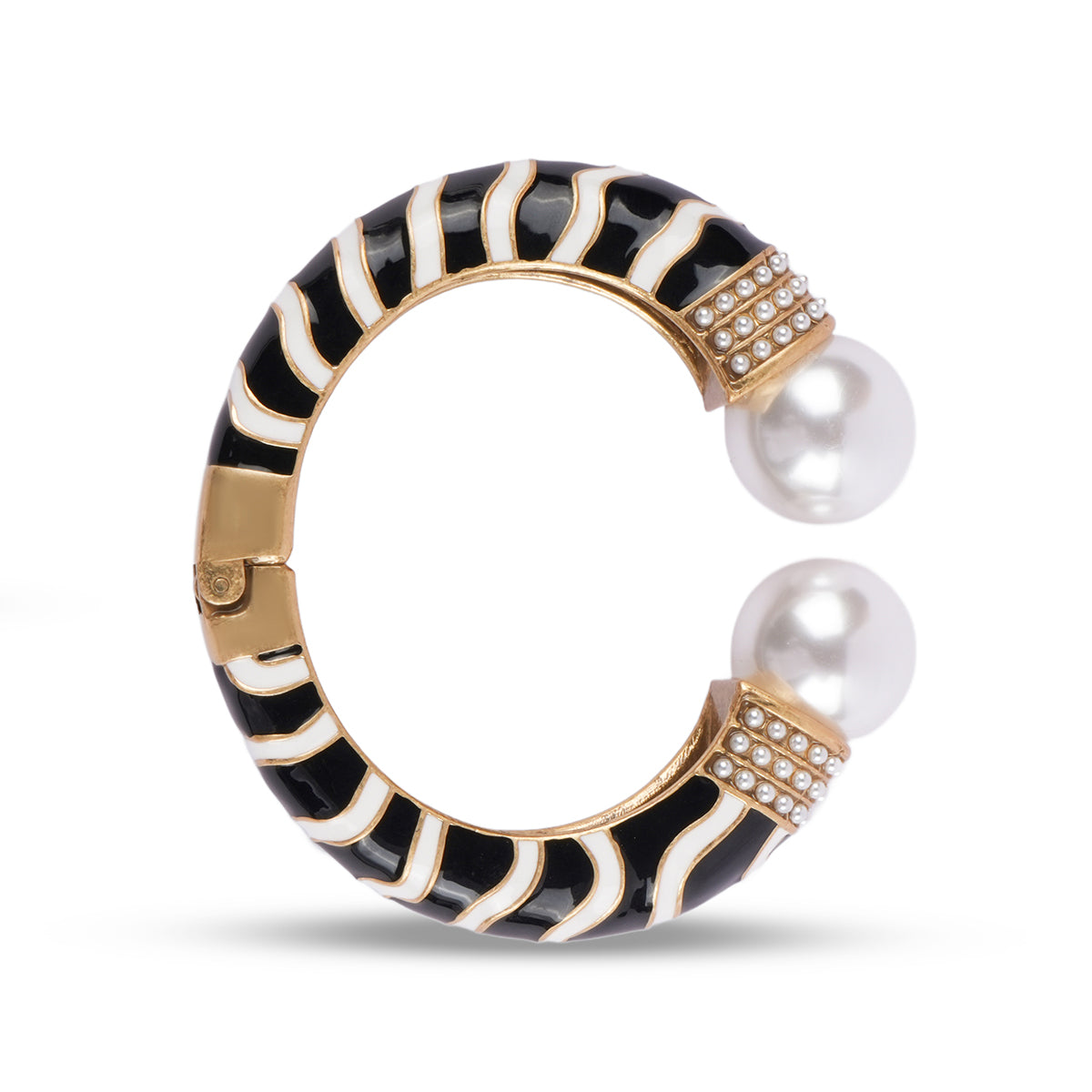 Hand-forged in recycled, earth-kind metals and plated in 18K gold, it wraps the wrist in luminous charm. A single pearlescent dome glows like captured moonlight, framed by Victorian-style enamel work that feels heirloom, yet fiercely now.