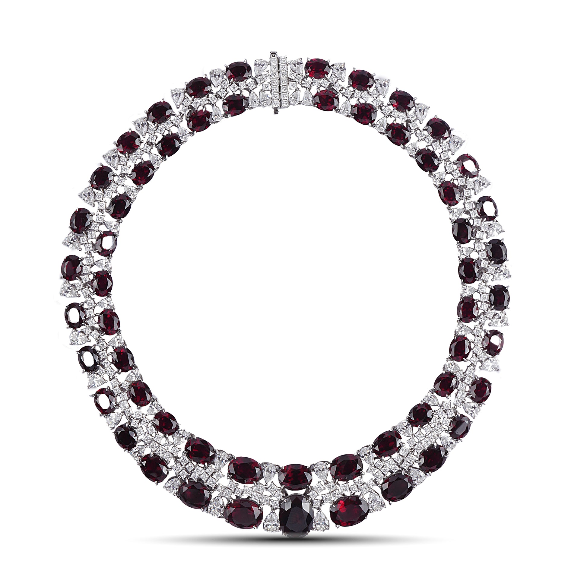 The Aurielle Necklace is a striking ode to contrast—deep garnet crystals kissed by the brilliance of diamond-cut moissanite, all hand-set in a shimmering line across solid recycled 925 sterling silver, finished with luminous rhodium plating for lasting radiance.