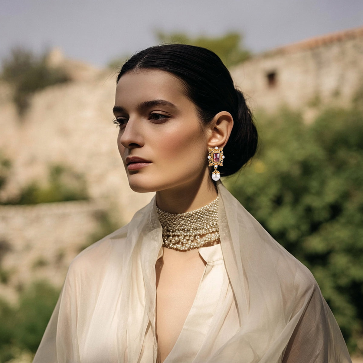 The Azaria Earring is hand-forged in recycled mixed metals, layered in a matte 18K gold finish that echoes antique opulence. Featuring garnet-toned stones and creamy pearl drops, this piece channels Victorian grace with a subversive twist—delicate, but never demure.