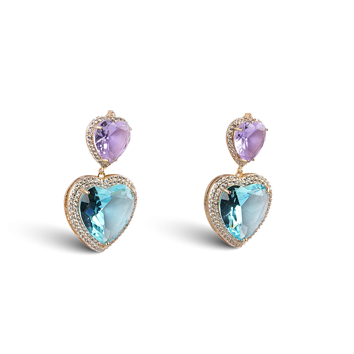 A little romance, a little rebellion—the Caelia Heart Earrings are happiness you can wear. Sculpted in a heart silhouette, these modern icons shimmer with lab-grown crystals in ethereal shades of blue and lilac, each facet catching the light like laughter frozen in motion.