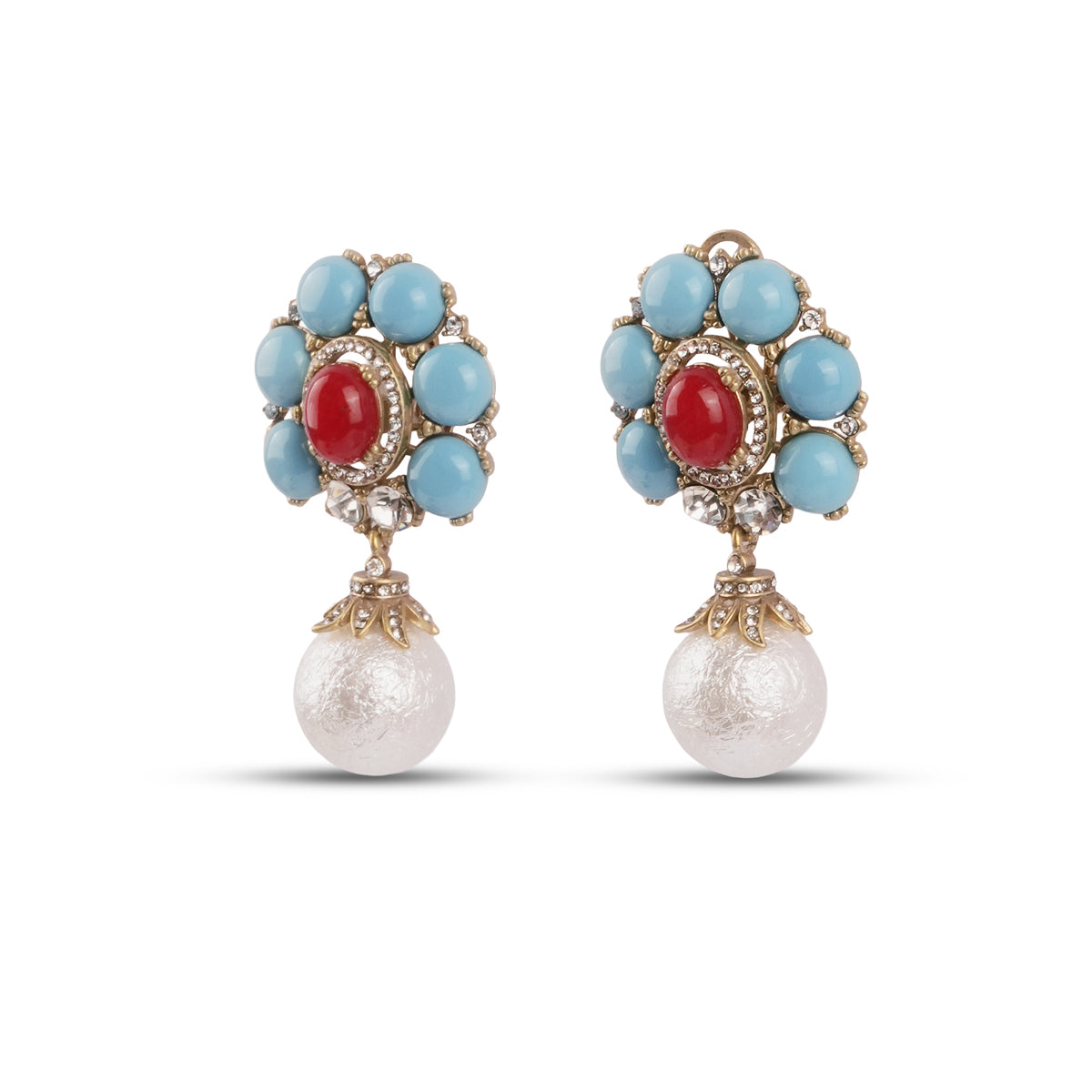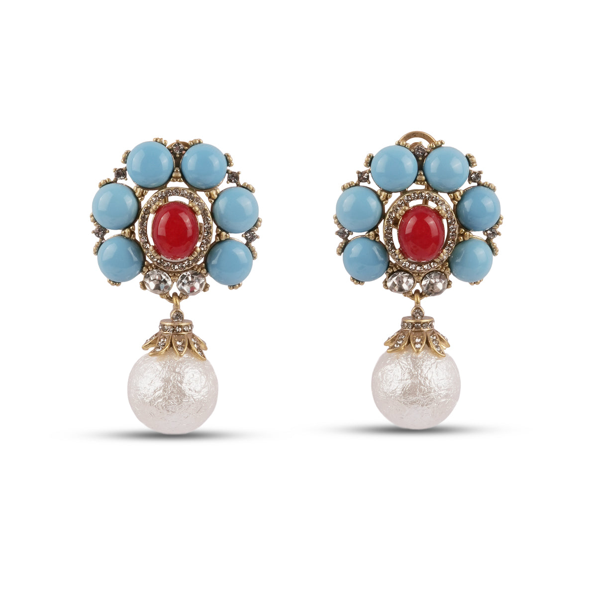 The Camélia Earrings are pure romance with a bold, modern twist. A stunning faux firoza stone takes the spotlight, framed with an inset ruby-hued center and finished with a pearl drop that moves softly as you do. The mix feels regal, but not heavy. Vintage-glam, but completely wearable.