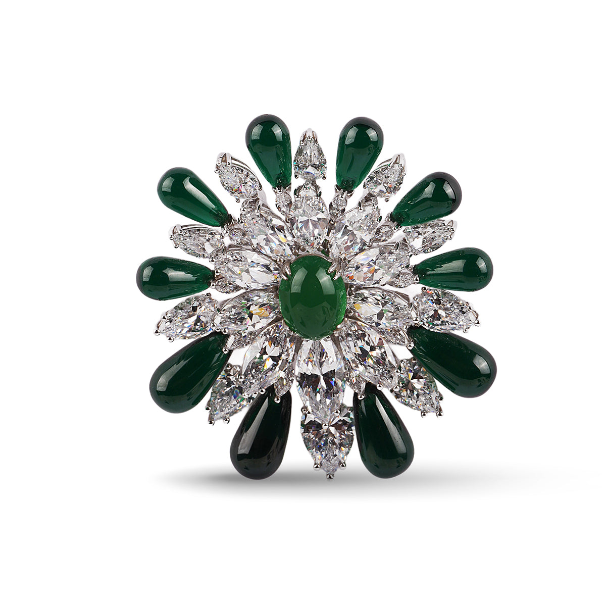 An ode to nature’s poetry and high fashion’s audacity, the Celara High Jewelry Brooch reimagines the chrysanthemum—delicate yet commanding—in radiant emerald-toned brilliance. Hand-forged in recycled 925 sterling silver and crowned with shimmering crystal moissanite and brilliant-cut zirconia, this piece is couture in spirit and conscious by design.