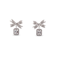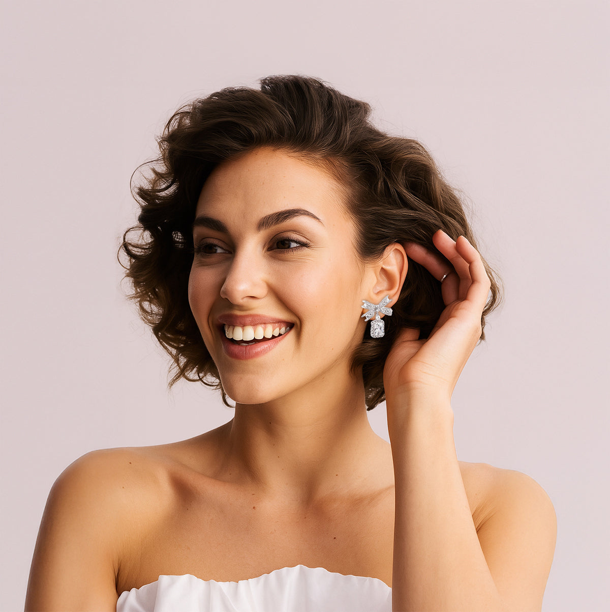 Charming and couture, the Circe Bow Earrings are a playful nod to old-world glamour with a modern wink. A sculpted bow glistens with a radiant square-cut Swarovski crystal—set in 92.5 silver and finished in luminous brilliance. Think diamond fantasy, minus the guilt. They're featherlight, high-shine, and endlessly wearable.