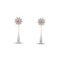 Forged in refined mixed metals and finished with a luminous rhodium polish, their silhouette feels both architectural and fluid. The long crystal drop design is weightless yet commanding, striking the perfect balance between statement and subtlety.