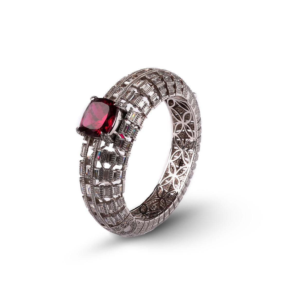 The Fleuron Garnet Bracelet is hand-forged in solid, recycled 925 sterling silver, polished to a high mirror shine, and finished in protective rhodium plating for heirloom durability. At its heart: a row of lab-crafted garnets, glowing deep crimson, nestled beside diamond-bright moissanites that rival the stars. Intricate carvings line the inner curve—artistry so fine, it whispers of forgotten palaces and Parisian archives.