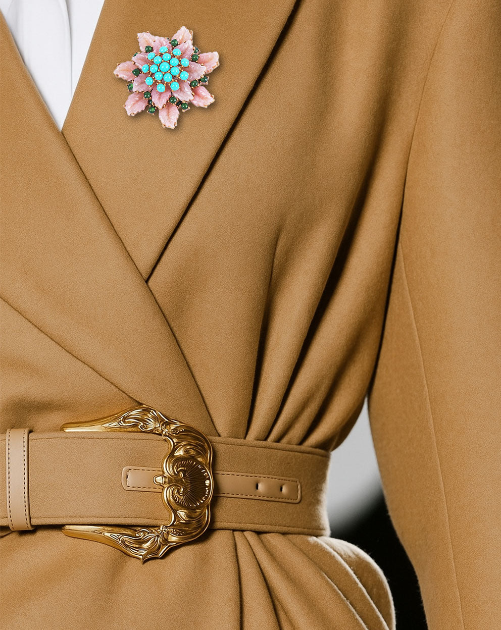 Designed as a sculptural floral motif, it layers resin coral with luminous firoza tones in a way that feels both regal and fresh—like a vintage treasure you’d spot in a collector’s drawer, yet styled perfectly for today. The mixed-metal finish adds depth and character, making the colors pop with a rich, dimensional glow.