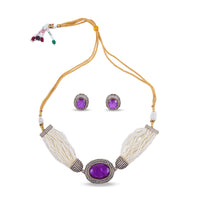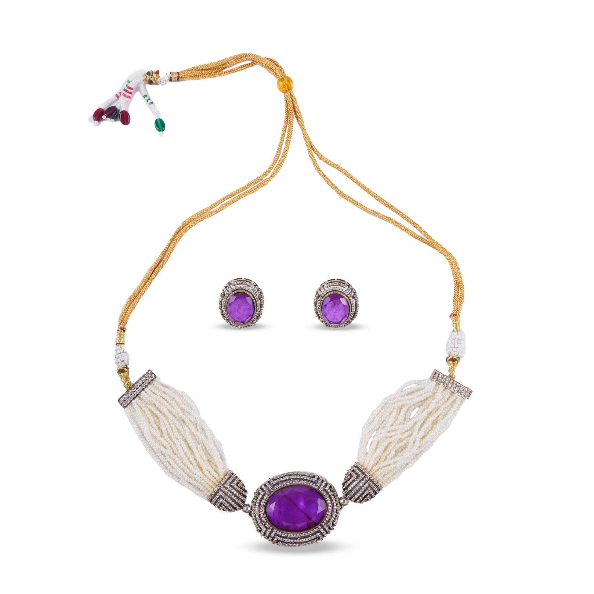 The Ishani Necklace Choker (in Purple) is a portrait of timeless grace—crafted in layers of luminous lab pearls that drape the neckline with quiet sophistication. Each strand is accented with lab-polki motifs, their brilliance framed in a brushed antique gold patina—a finish that feels more couture than traditional, giving the piece its signature depth and refined character.