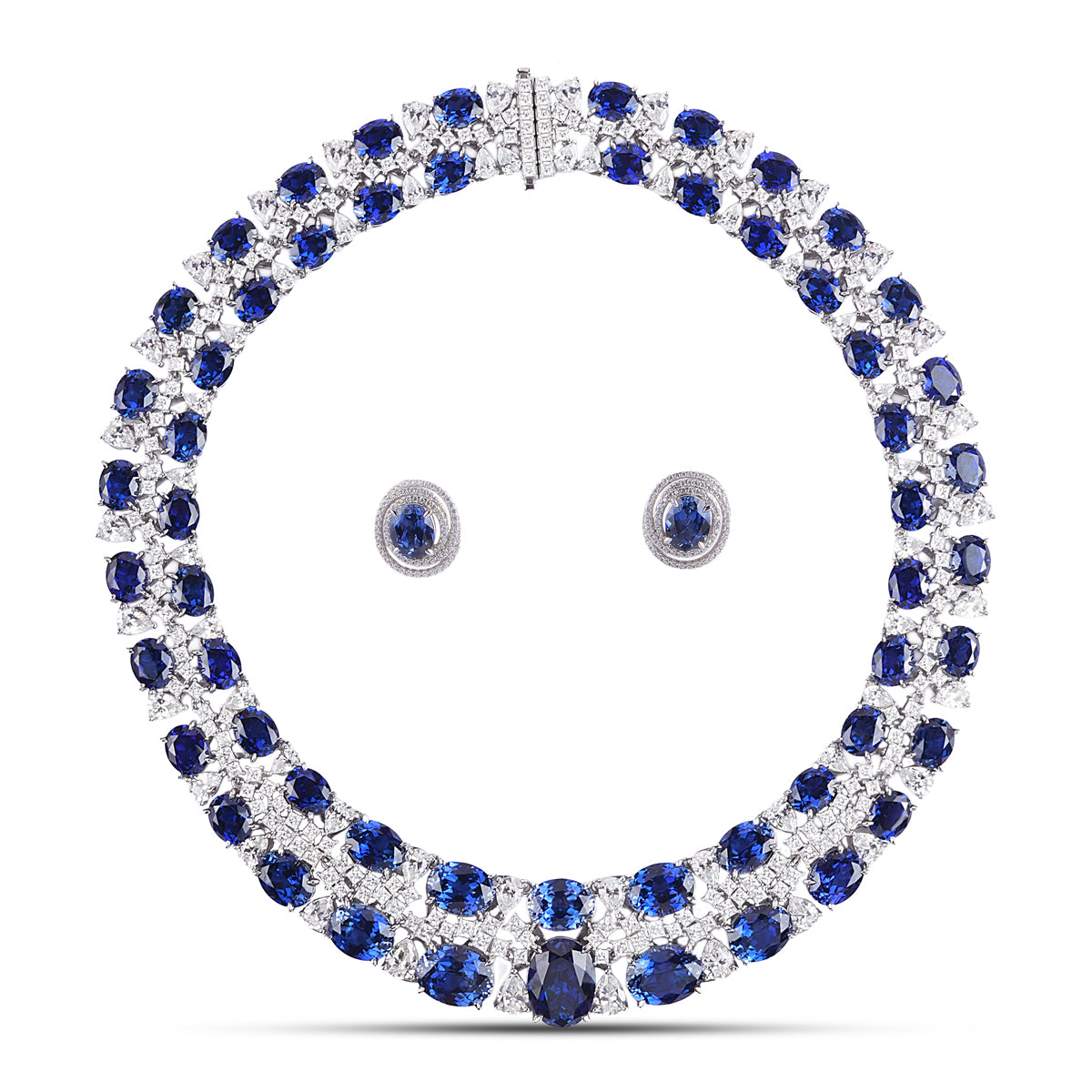 From the Ornate Collection comes a necklace that feels like poetry in precious form — a harmonious marriage of rich, deep-blue elegance and diamond-like brilliance. Lab-created sapphire–hued stones, cut with masterful precision, framed with eco diamonds whose fire rivals the rarest gems. Together, they create a dance of color and light — the moissanite’s pure sparkle amplified by the sapphires’ mysterious depth.