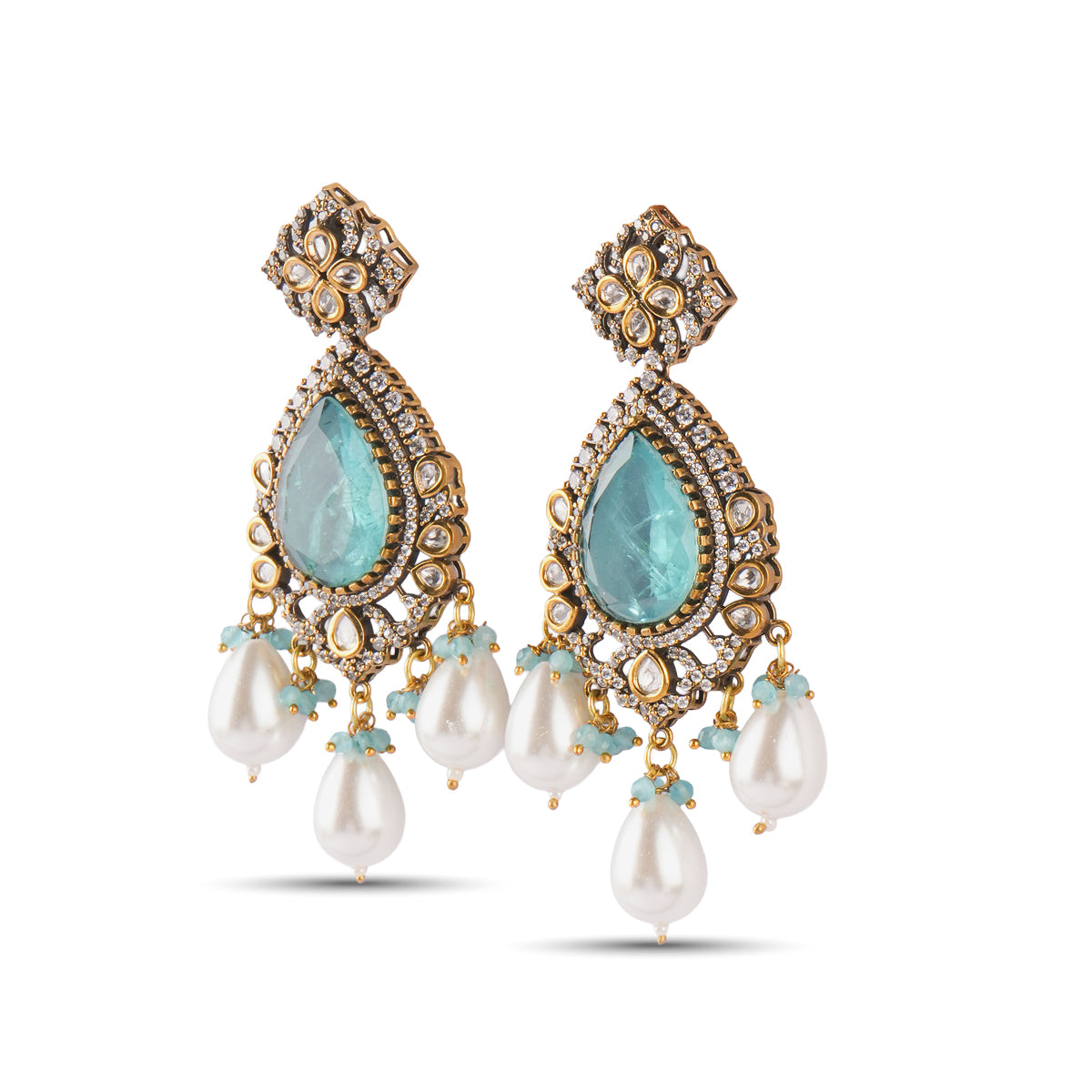Finished with large, elegant pearl drops, the design balances drama with femininity. The contrast between the luminous blue stone and the soft, organic pearl creates a refined silhouette that elevates evening wear, celebrations, and special occasions.