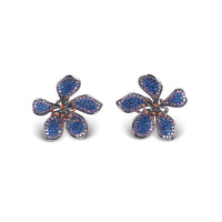 Where nature meets couture, the Fleur Éclat Earrings bloom with unapologetic radiance. Sculpted in a bold floral silhouette, each petal is alive with precious blue crystals, accented by fiery amber-hued stones that shimmer like a dusk-lit garden.