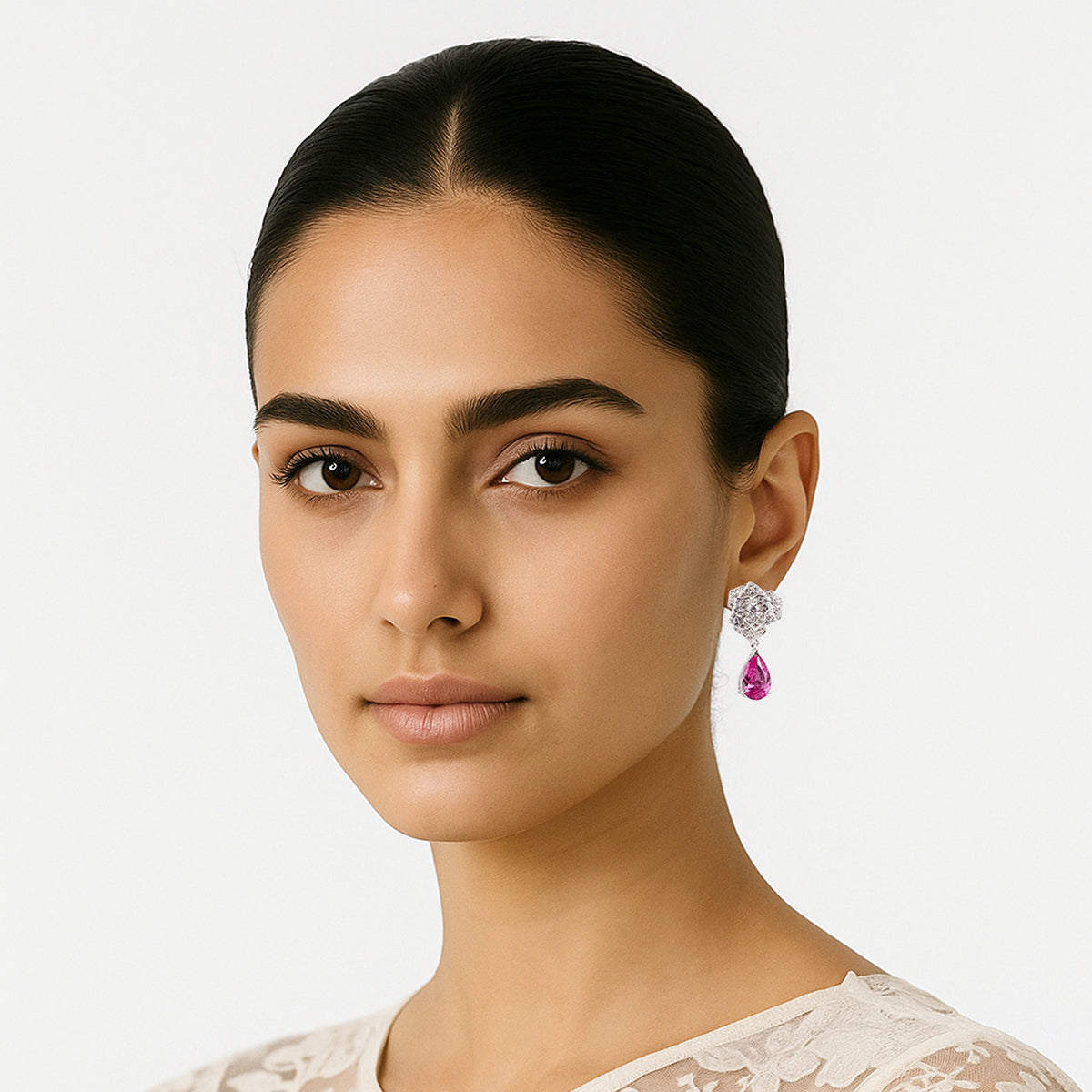 These ethereal drops are hand-forged in recycled 925 sterling silver, plated in luminous rhodium, and adorned with lab-created pink moissanite gems that capture the charm of rare pink diamonds—without the royal ransom.