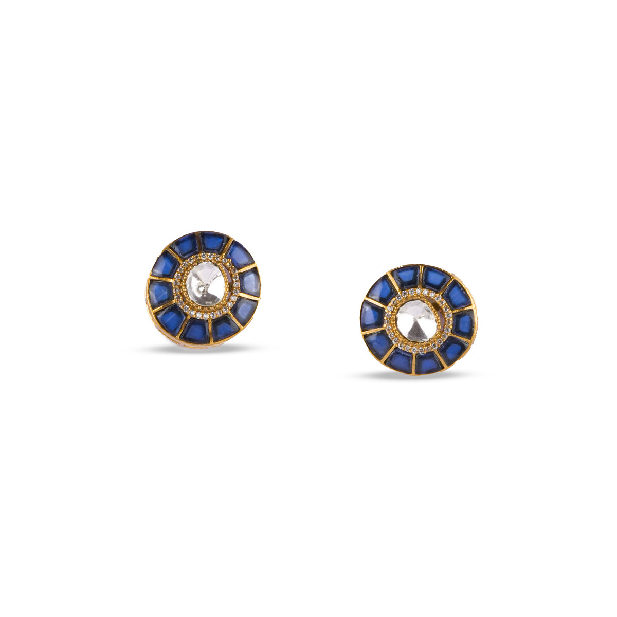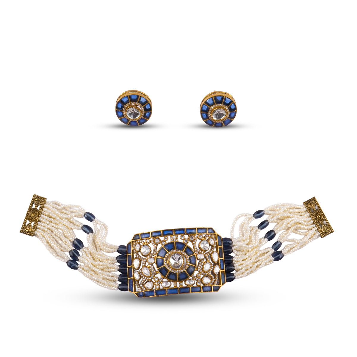 Strung with multiple strands of luminous Keshi pearls, the choker drapes the neck with liquid grace, secured by an adjustable tie-back string for the perfect fit. At its heart, sapphire-inspired gemstones glow with a regal depth, framed by intricate kundan craftsmanship over silver foil, a technique once reserved for royal ateliers. Finished in lavish 18K gold plating, the design radiates a glow that whispers of heritage yet speaks to the modern bride.