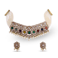 The Roshan Necklace is a story of radiance—crafted to capture light and reflect it back with untamed elegance. Strung across multiple layers of lustrous pearls, the necklace drapes like liquid grace, anchored in mixed metals and illuminated with crystals. At its heart, delicate lab-polki hues shimmer with quiet opulence, each detail framed in a soft antique-gold polish that evokes the romance of heirloom treasures.