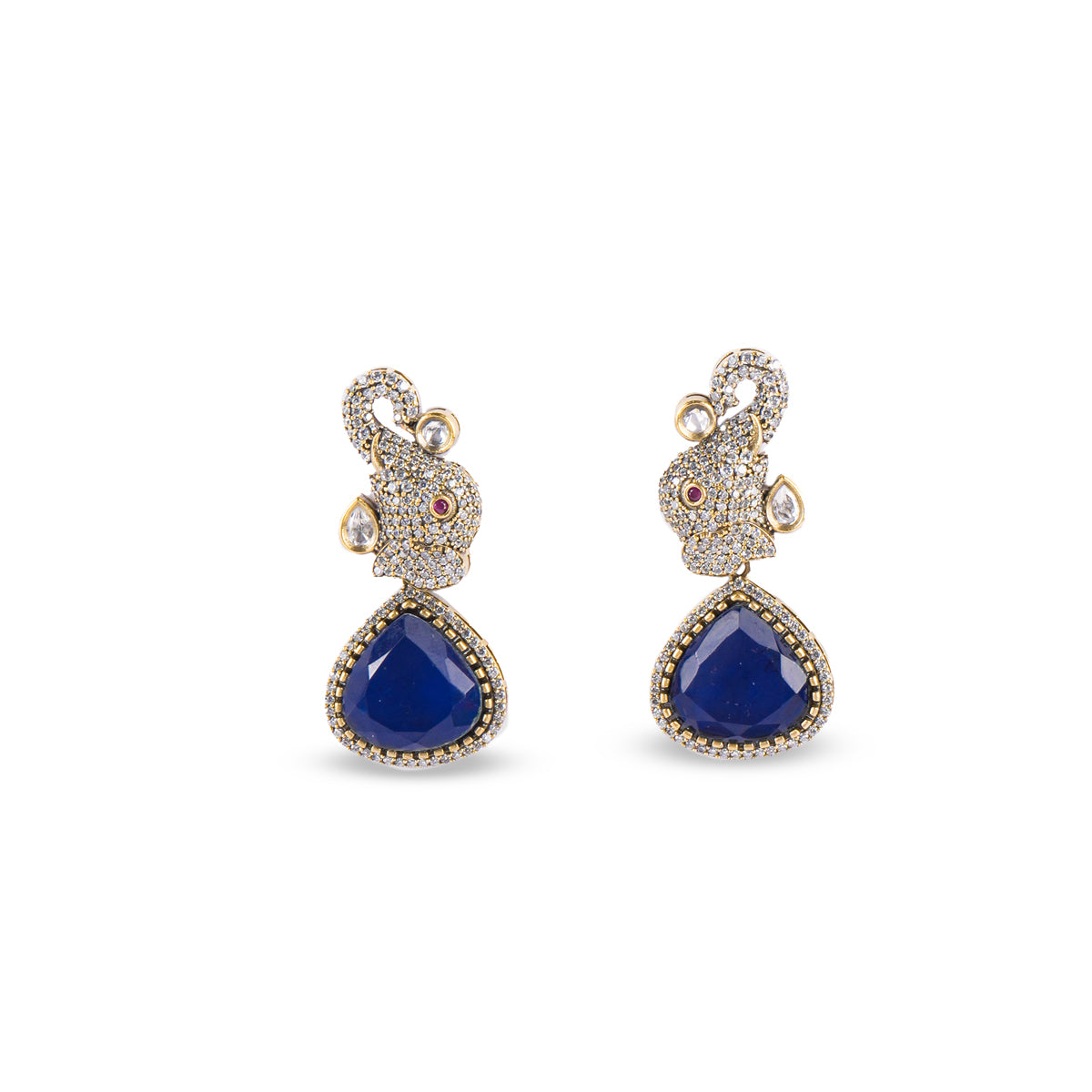 Blue fire, regal lines. Safiye is a high-jewelry mood made effortless—an heirloom-style kundan necklace with matching earrings, crafted in sustainable mixed metals and sealed in luminous 18K gold plating. The stones are highest-grade lab kundan that mimic natural diamonds, lit with faux blue sapphire accents. A jeweled elephant motif—rendered in fine crystals—adds a touch of royal folklore. The adjustable traditional thread (dori) lets you fine-tune the drape for a comfortable, elegant fit.