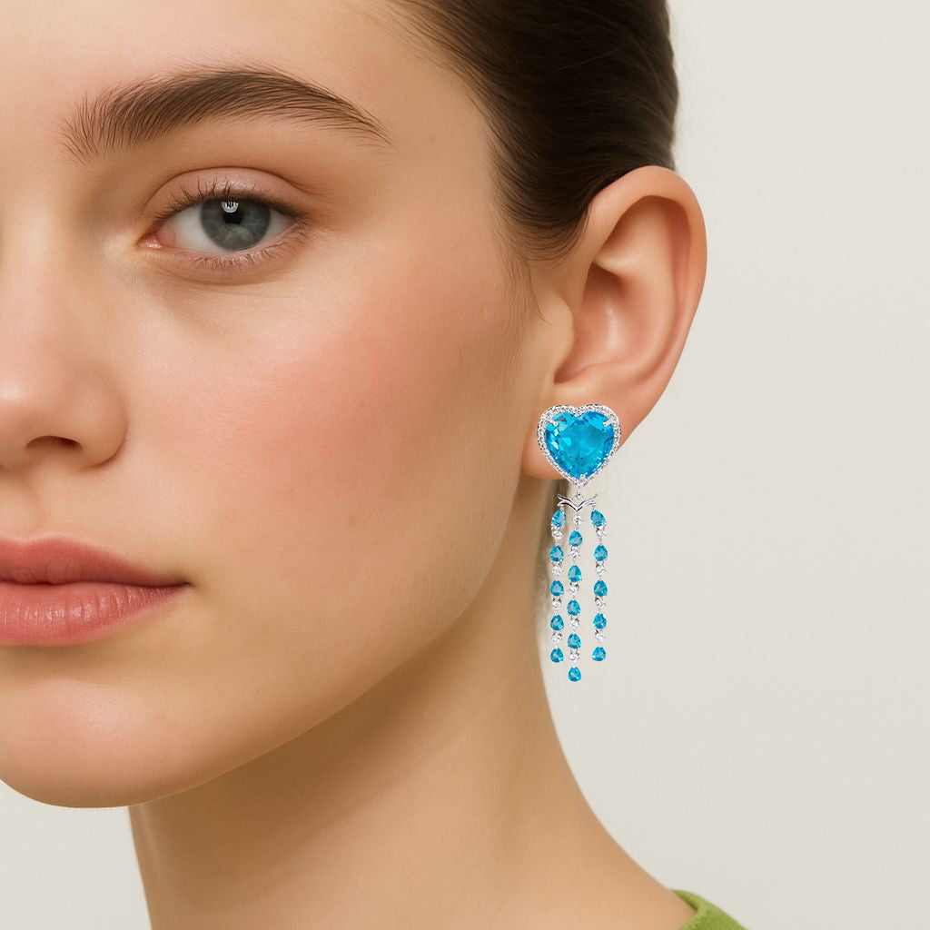 These cascading blue earrings channel the joy of a summer downpour—unexpected, refreshing, unforgettable. The heart-shaped studs melt into soft droplets, making each sway feel like a flirtation with the sky.
