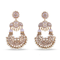 The centerpiece: lab-crafted polki-inspired stones framed in delicate lilac enamel detailing, their soft hues lending an ethereal contrast to the bold crescent silhouette. Each crystal is precision-placed to capture light from every angle, evoking the radiance of chandeliers in a palace courtyard.